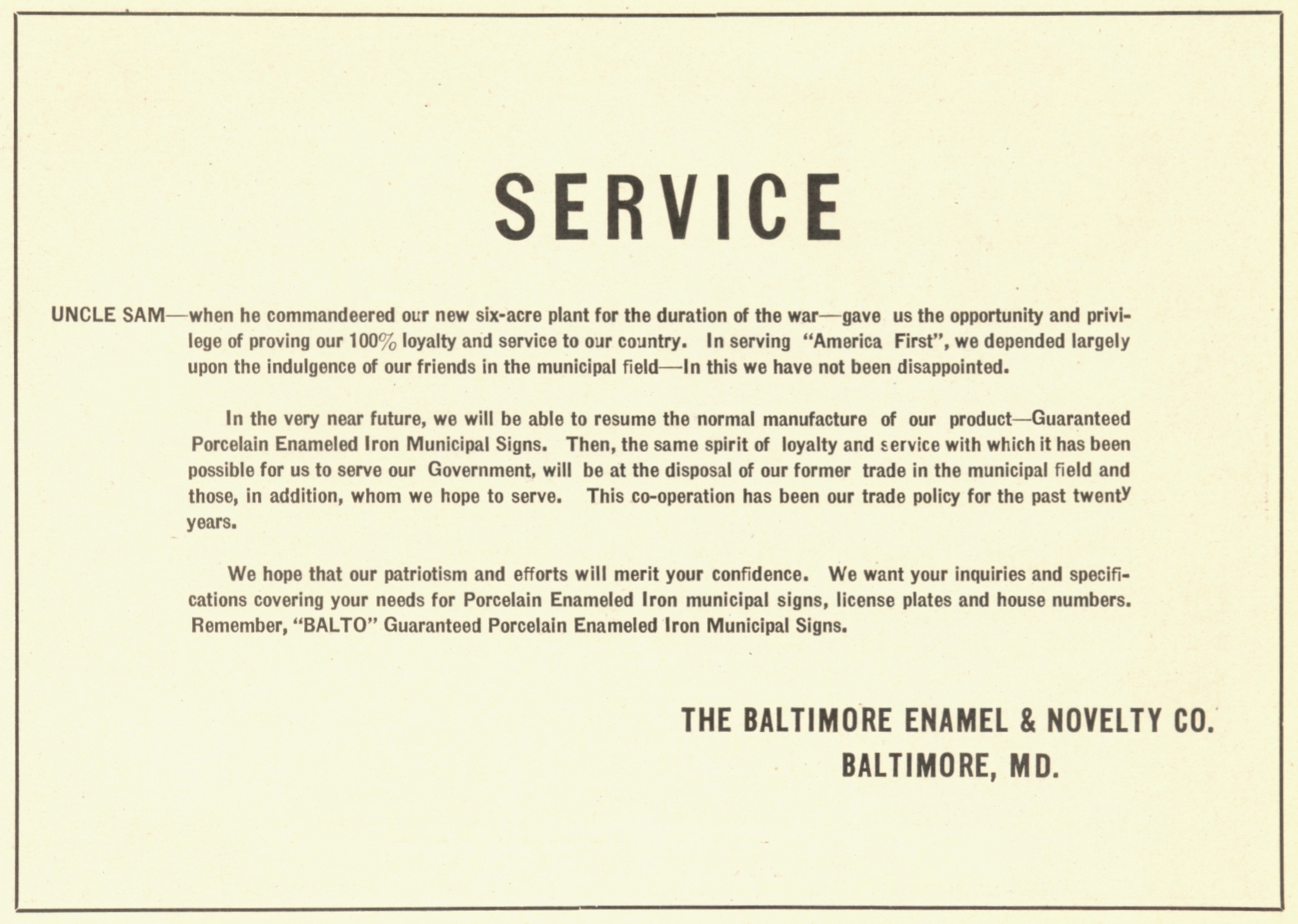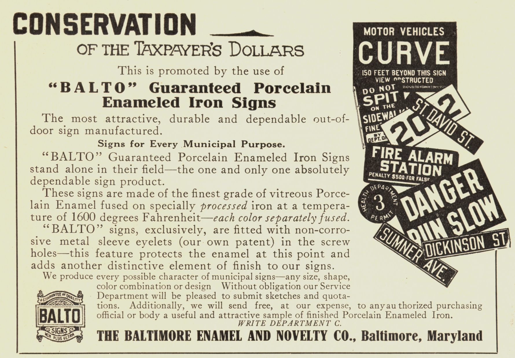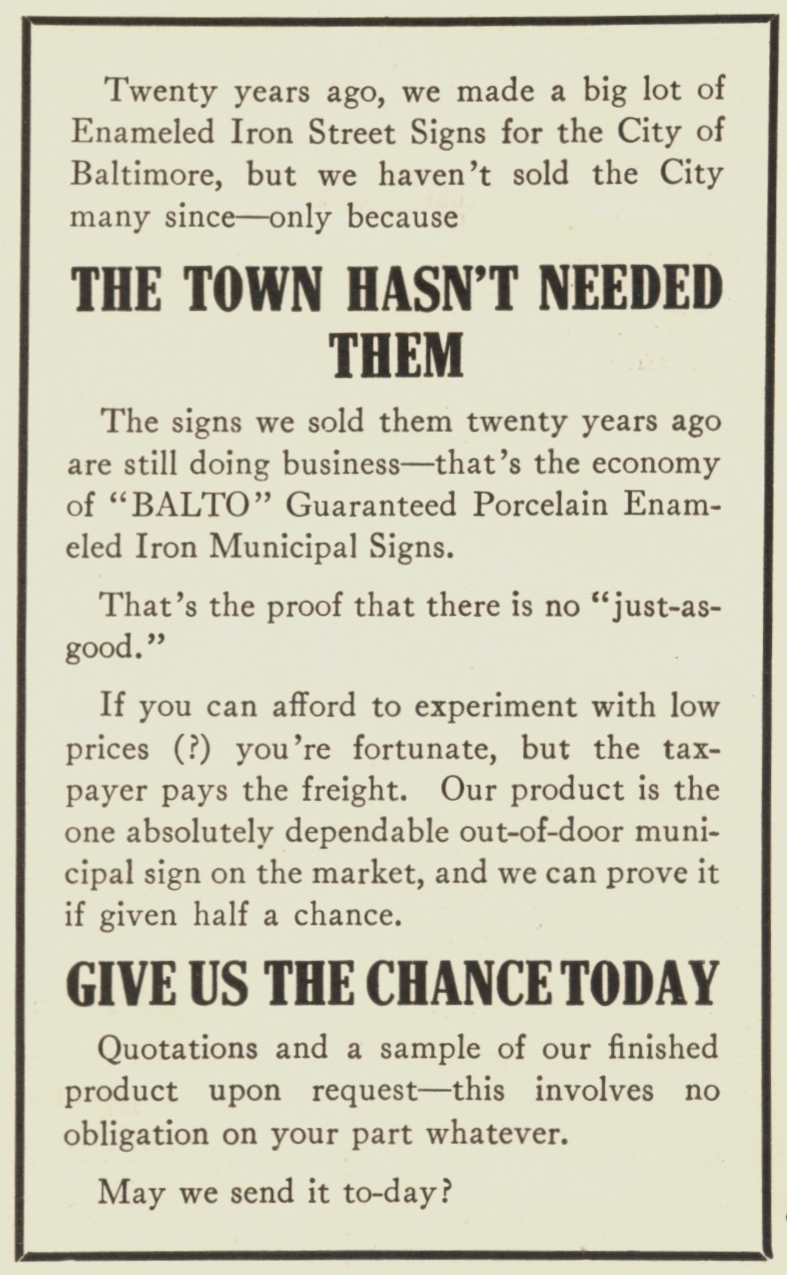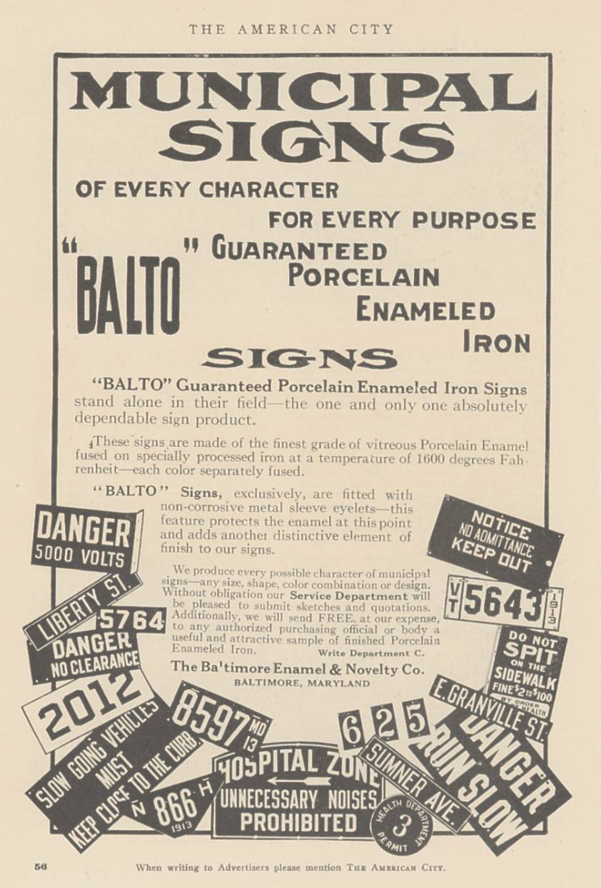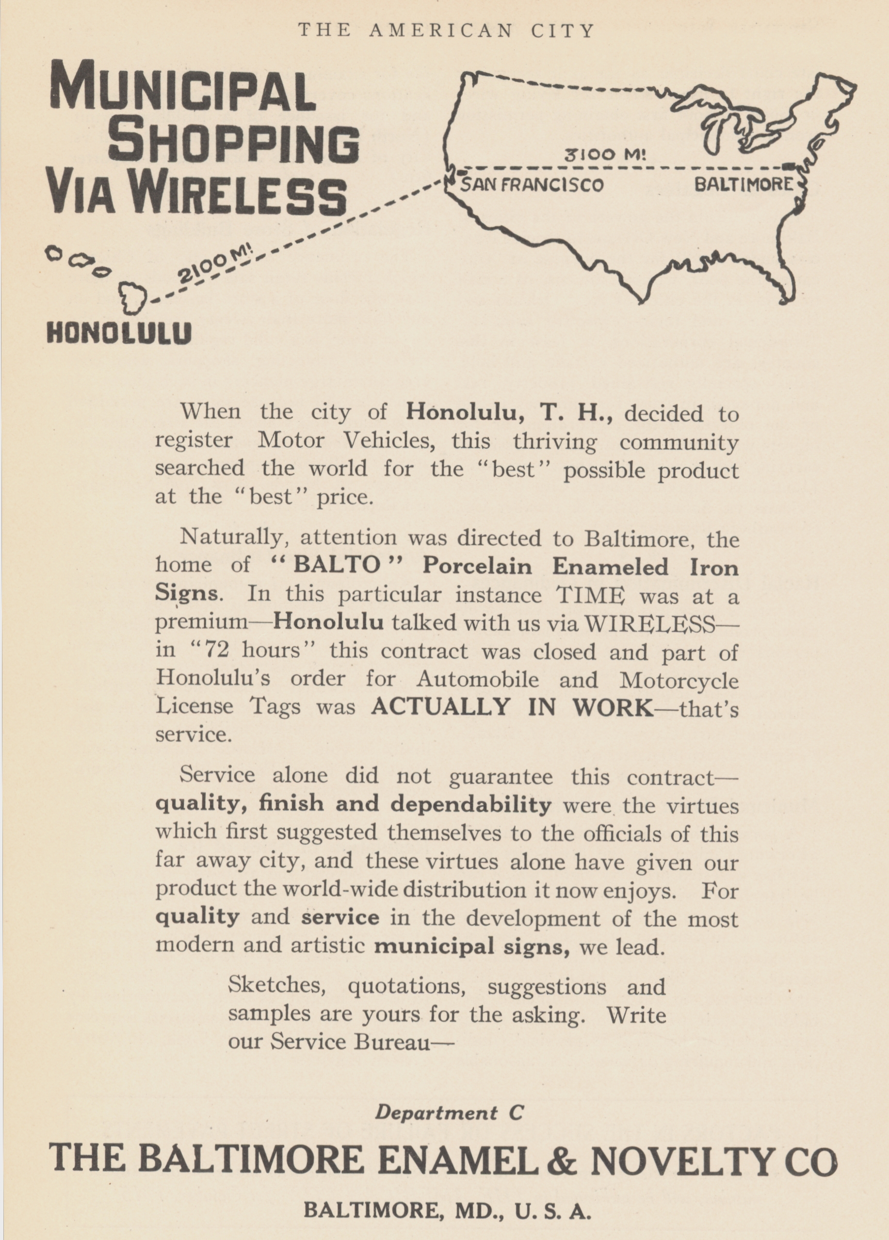 BALTO Advertisement in "The American City" (1915) trumpeting the fact that Honolulu ordered plates from them that year |